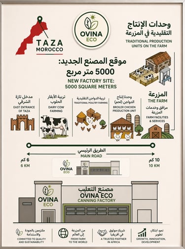 Le projet OVINA ECO marque un tournant stratégique pour le secteur agricole de la région Fès-Taza. Nous lançons la construction d'une unité de conditionnement ultra-moderne de 5 000 m², située stratégiquement à l'entrée Est de Taza.